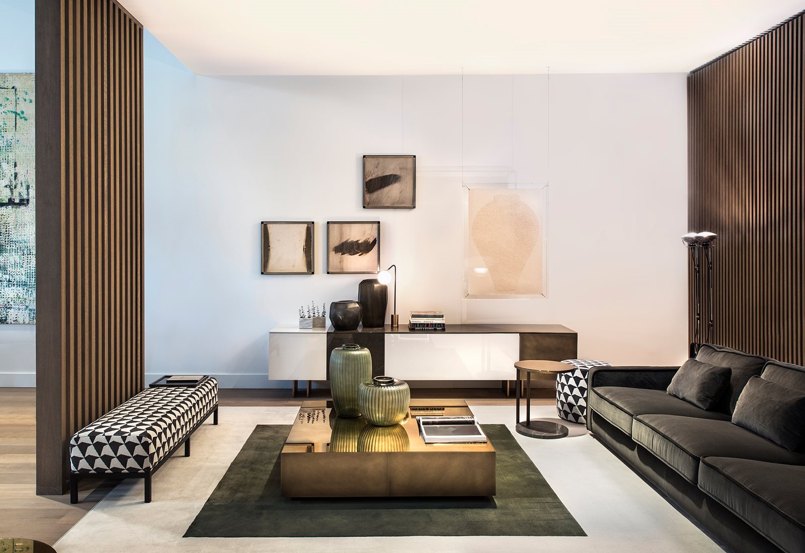 Ruben. Modułowe, niskie szafki naścienne lub na metalowej podstawie. Proste, czyste linie wzmacniają poziomy rytm wnętrz. Szafki oferują rozmaite funkcjonalności i szerokie możliwości dopasowania do charakteru aranżacji. Drewno, lakiery, brązowiony mosiądz, marmurowe panele dają swobodę wyboru.